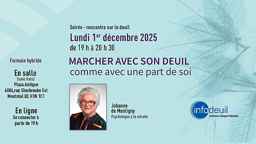 Johanne de Montigny, psychologue à la retraite, collabore régulièrement avec Le repos Saint-François d’Assise/infodeuil.ca — Elle accueille et anime les soirées-rencontres sur le deuil, préside et coordonne le colloque annuel sur le deuil et publie des livres, des textes et des essais sur la thématique du deuil et sa traversée. « Au plus près du deuil » — disponible en version électronique sur le site web du RSFA — vient de paraître dans une version papier gracieusement offerte par Le repos Saint-François d’Assise/infodeuil.ca